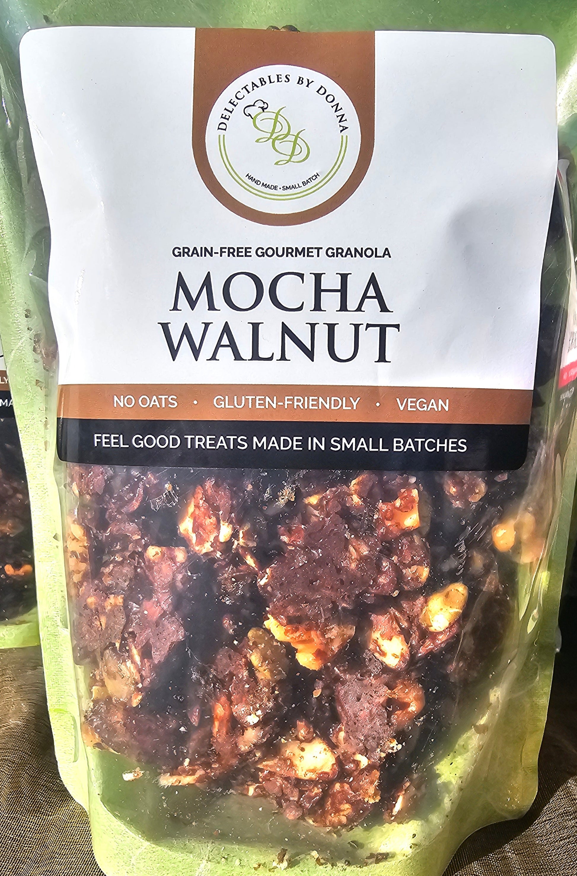 The Mocha Walnut is a nut combo of sliced almonds and omega-rich walnuts, along with pepita, sunflower and flax seeds. The mix is roasted with a sauce infused with cocoa powder, espresso and vanilla extract.